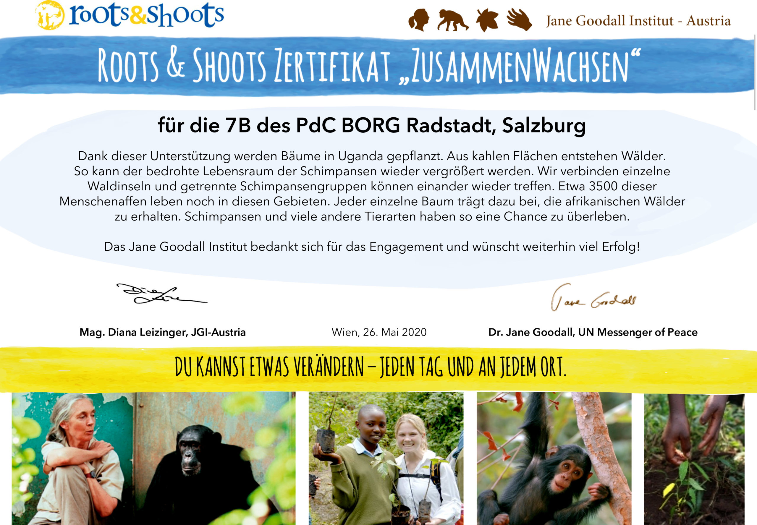 Roots & Shoots Zertifikat „Zusammenwachsen“ für die 7B